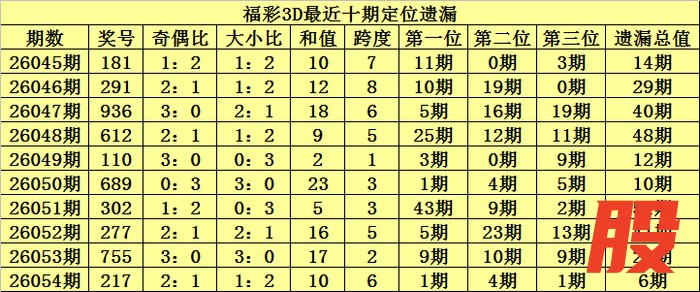 开奖回顾:福彩3D第2026054期奖号:217,百位号码遗漏1期、十位号码遗漏4期、个位号码遗漏1期,遗漏总值为6期。