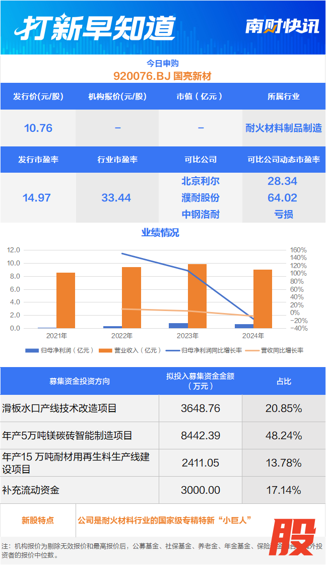 1月14日中银两融中银两融,可申购北交所的国亮新材(920076.BJ)。该公司成立于2002年,地处我国重要钢铁生产基地一河北省唐山市,是一家专业从事高温工业用耐火材料整体解决方案的高新技术企业,为客户提供耐火材料整体承包服务及耐火材料产品。