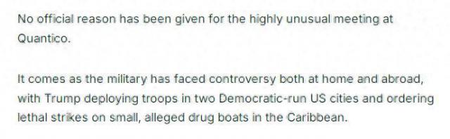 法新社的报道说,这场会议极不寻常,五角大楼至今未给出正式解释。当前美军正深陷国内外争议:特朗普不仅向两个民主党主政城市部署军队,还下令对加勒比海域疑似"贩毒"的小型船只实施致命打击。